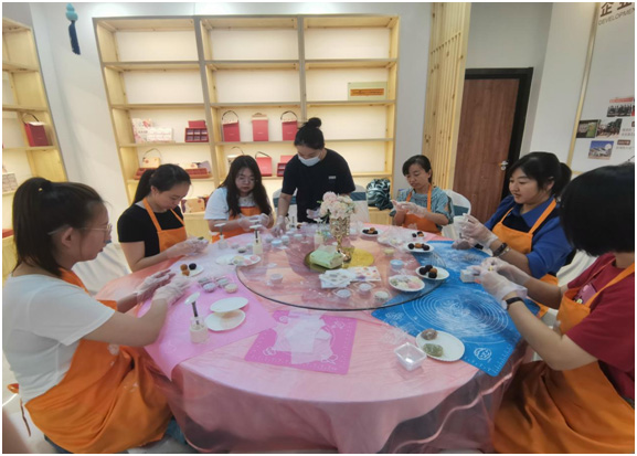 月饼制作工艺精细繁杂,用料考究,专业老师现场指导,讲解月饼的用料,制作工艺,以及食用方法。